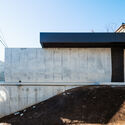 建筑师根据地形将建筑划分为地上一层以及局部半地下层两个部分;半地下层的平面由盥洗空间,两间卧室以及车库组成。盥洗空间与卧室的部分被放置在一个对外完全封闭的混凝土盒子里,一旁的车库则完全向外敞开。该盒子被放置在基地与相邻街道的整个范围的中心,并配合地形架起上层的楼板。一层的空间被独自站立的四面混凝土墙体围合而成,梭形的断面使得墙体从街道上看去像是几块搁置在平台上的巨石。墙体赋予内部空间厚重的神秘感的同时也创造了自身周围空间的连续性,从而模糊了基地内部和街道的边界。