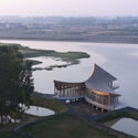 浮舟纪村民中心选址于信阳刘岗村水库岸边,形成"三面环景"的空间格局。水库作为农业灌溉水源,水位随耕作季节的抽水灌溉呈现周期性涨落,村民的农耕生活围绕着水库展开。
