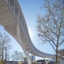 这座 80 米长的曲线天桥以柔和弧度跨越弗朗茨-卢斯特街(Franz-Lust-Strasse)的四车道及中央有轨电车轨道。街道两侧采用分叉式立柱设计,宽幅悬臂与悬铃木行道树融为一体;停机坪前方增设独立支柱。