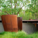 设计过程中,我们注入“筒”这一元素,让他们嵌入屋顶和墙体。材料上顺应雨棚,使原本平面的耐候钢屋顶延申到地面,成为与游客互动的空间。我们特意将乔木纳入筒的核心,让树木成为这个空间的主角。空间也在筒与树阴形成庇护共生的关系下形成双重包裹。筒内预留了休憩座椅的空间,目前暂受乔木支撑木限制暂未放置。不过游客仍可以步入其中,体验这份宁静。