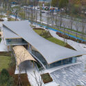 建筑形态通过具有张力的线性变化动势与滨水公园的自然景观相呼应。我们让建筑沿着自然的肌理“流动”、“张拉”、“转动”、“打开”,通过与景观地形互动,增强了空间的连续性和活力,打破了传统建筑与景观的边界,使得空间之外的公园绿地场所也可以在全季节全天候积极地与室内空间协同,为大家的户外活动提供连续的场所。