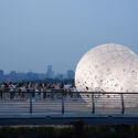 8 - 10 月是上海台风高发月份,而装置位于黄埔江边的甲板上,结构安全性是首要考量。经纬球结构技术难度低,更便于快速安装与拆除。整体结构采用管径 30mm 的方钢管,并对经线方向及开口处圆拱的杆件进行加粗,以满足球壳被切分后的悬挑需求。由亚克力板制成的剪纸兔子具有防水性能,并为球壳表面带来镂空,以便让江风穿过,消解了风荷载对于装置的影响。
