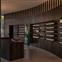 古建偏爱大漆,其深沉浓郁的质地在微光下呈现出含蓄内敛的东方气韵。弧墙借由木材的天然纹理与大漆的温润反射,将室外的自然光与绿意“借”入室内。为保持视觉的连贯性,货架隔板与墙面特意脱开2cm;香水柜门则选用湖泊绿彩釉玻璃,如滤镜般加深了绿影的重叠。