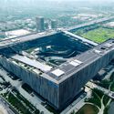 作为科技研发建筑,项目追求超尺度的大平层办公空间。依托超过 8 万平方米的用地规模,建筑由两条水平体量构成,单层办公宽 40 米、最大长度 440 米,标准层面积达 2 万平方米。平面中部每 120 米设置共享中庭,引入自然采光与通风,成为科研人员交流汇聚的核心节点。