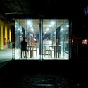 During daylight there is a complete transparency from the inside of the building whereas from the outside visitors see an opaque volume. As the night falls we have the inverse situation. The sliding glass panels allow a wide open access from the platform and natural cross-ventilation. Also the brise soleil opens for maintenance and cleaning. The internal space is organized through the cafe's counter, the only fixed piece of furniture which concentrates all necessary installations and equipments.