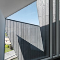 外立面覆盖着一层深色的锈化处理的打孔Rheinzink网板。这样的处理给材料更丰富的颜色,使其更贴近周边木质房屋的色调。这种微微闪光随一天时间不同又有阴影变化的外表皮还是第一次被应用。建筑的模数及紧凑的网格排列让来到这里的访客感受到建筑尺度的趣味和愉悦。Jansen工业园从内到外几乎都由离场地几公里内获取的材料建成。这点也反映了这一区域的企业实力、对可持续原则的推崇及对节能的努力与关注。