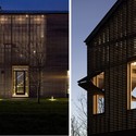 房子的入口的沿着木板路。输入序列将通过建筑的装有百叶窗板的皮肤变成一个两层高的大厅俯瞰三层室内花园庭院。入口的序列吸引人从百叶的表皮进入一个二层通高的门厅,俯瞰一个三层的室内花园。这个住宅的公共部分抬升到二层,有一个长向的视线。主要空间,开放的起居室、餐厅和厨房,向下面的桌球房开放,以及一个夹层,夹层是一个微妙的三维混合木与钢构架并允许天光进入。一个巨大的石头壁炉从室外将这个大厅分隔开,屏蔽了玄关。夹层开向室外的一个屋顶花园,与一个椽子的研究有关。