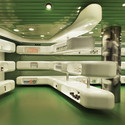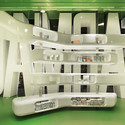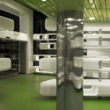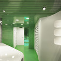在内部,在标志后面,一个绿色的金属板覆盖层从天花板开始下降,穿过了后墙下到地面,加入到同样颜色的环氧树脂地面砖中,它们都成为销售家具的背景:在五个层次的自发光的带光泽白色管子元素,看起来悬浮着并将空间分割成不同的区域。这些片段也组成了旋转的桌子、椅子、控制台……并最终提供了必要的空间来展示产品。这是新销售模式下的新场景。