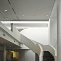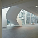 新建筑部分融入了场地,相邻的建筑就像一个俄罗斯方块,因为它需要连接现有的楼层平面和交通流线。平直的网格(以及后面简单的盒形建筑)上安放了培训室柔性的曲线墙体以及一个具有雕塑感曲线的楼梯为建筑带来了乐趣,