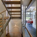 线性结构的设计使得南北向开敞最大化。尽管南立面的玻璃区域面积很大,但纵深的竖挺和浅纹路提供了遮阳。通体使用低辐射玻璃。在南北立面上,四英尺高度的线性窗提提供自然光和风。墙体和屋顶都采用了附加的隔绝层。比起业主之前的房子,每平方英尺将少消耗40%的供热与制冷能源。