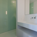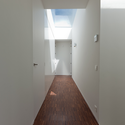 楼上沿着走廊组织房间,以天光照明。木头覆盖地面的表面创造了一种统一性和白墙形成鲜明对比。