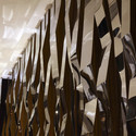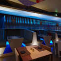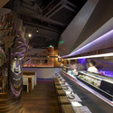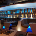 每个区域都通过一个折纸元素得以塑造,这一元素由彩色的不同材料建成,如穿孔铝复合板、半透明石材板与线条织物。通过不同的照明效果,每个区域都拥有其自然的空间特点。餐厅中的不同区域还通过一个从入口到贵宾间再到商店尽端的折纸型吊顶联系在一起。它整合了这些不同的区域,创造了一种餐厅内的空间转换。