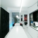玻璃,碎石,毛毯,和无数的彩色照明系统。浴室的地板到天花板都是磨砂玻璃,家具的正面是有机白色玻璃,非常适合LED面板。镶嵌家具框和滑动折叠元素被柔软的皮毛形式的Flokati纺织品增加了柔软的触感。即使可能不会立马明显,但达到了建筑师非常个人化的“理想的世界”。
