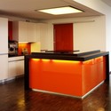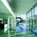 需要一提的是内饰,都是使用的天然材料。深色橡木饰面和外幕墙的墨绿色天然石。该建筑的设计方案的总体影响是相应的非常和谐。室内外区域入口处做的很特别,采取通过与特定的公司特质相互关联的一个引人注目的共生关系。特别引人注目的是在这方面都以绿色和橙色这样非常典型企业的深浅颜色的特征。颜色方案是圆形的白色墙壁。创造的整体氛围是明亮友好的。玻璃幕墙的主轴线使钢结构可以从里面看到,然后眼睛会被吸引到钢楼梯栏杆及邻近的走廊。
