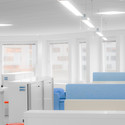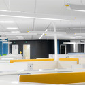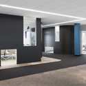 会议室则更加正式,配有淡灰色的色调和坚实的木桌,同时可以瞥见开放办公区的强烈色彩和进行的活动。