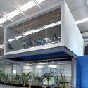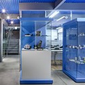 用于外墙的波纹铝板给予人们在任何意外情况下的隐私和安全。透明的玻璃把展厅和办公区域隔开,并允许管理人员和技术任务之间永久性的视觉接触。