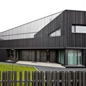 住宅位于附近街道边,朝着垂直方向延伸,南侧的二楼空间更加向内靠,从而获得直接的阳光。二楼卧室有着开阔的绿色露台,建筑外表分布丝丝的黑木条,但它们完美融合,形成统一的整体。从屋顶露台可以瞥见环绕之间的金属灰木梁。从一楼的两个卧室的门可以拾阶而上进入上层的露台,上面的一个开放式的居住空间通过一个圆形屋顶灯可见。在一楼第三个房间,可用作客房还可以作为一个水疗中心。这座黑色混凝土地板的房子,背后的外部甲板由木材板构成。