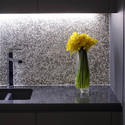 使用重蚁木把翼墙一分为二;用橡木做的楼梯通到夹层的卧室,通过楼梯上的无框玻璃栏杆可以看到下面的两层高的休息室和餐厅。隐藏式门鳍墙壁——通往一楼的卧室,浴室,娱乐室和存储间。一个全高度书架把衣帽间和厨房从从主休息室分开。