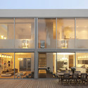 这堵高高的粉刷砖墙未位于住宅的传统形态中,与相邻的室外烟囱结合,提供了客户要求的朝向前侧的必要的隐私,并与住宅后方朝北完全采用玻璃与开放完全形成对比。