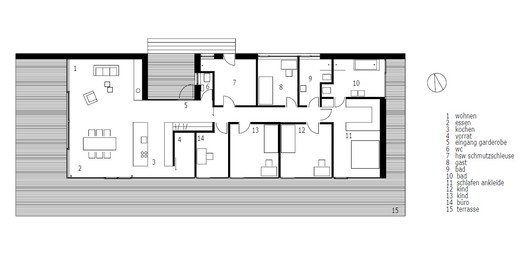 大玻璃窗区域与平屋顶最佳利用了太阳能。主要核心的大屋顶悬挑出,避免了夏日的烈日。