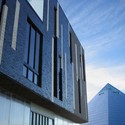 地下商业空间由一系列标准的玻璃店面组成,绝缘聚碳酸酯护套安装在不同宽度的店面上。墙体框架为16英寸的间隔,在中心透过半透明的聚碳酸酯薄膜可见,成为了玻璃店面上的垂直元素。在北墙,西部和西北部立面覆盖着四种颜色的砖,并在垂直向采取了不同的模式。垂直向的窗户具有不同的高度和宽度,并以一种随机的方式用颜料穿透。聚碳酸酯板覆盖在西南立面上,平分了建筑的的上部楼层外。该结构的其余部分采用了四种类型的砖,在柔和的颜色范围内以不同的宽度和垂直取向模式排列。