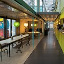 在餐厅的前面和后面的集装箱通过一个光滑的连接组合,不仅形成楼梯连接两个楼层,也有助于排水与让自然光到达空间。每个集装箱具有自己定制的特点、新的和再生的家具以及与众不同的照明设计。