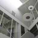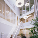 这样巧妙的组织设计使扩建的部分可以依附于Duisenberg 大楼的三层建筑中。顶层是图书馆,通过一条空中桥梁与主楼相连。图书馆的下面两层是办公室和演讲礼堂。这一程序化的逻辑安排确实带来了一个结构上的挑战,因为它将开放的演讲礼