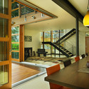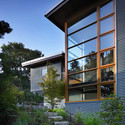车库位于住宅的西北角,独立的客卧在其之上,同时向外挑出形成了入口雨罩。建筑主体部分占据了相对的地块。它的东南角被完全拆除,取而代之的是30英尺长的管状物,作为屋顶的结构支撑。钢结构木铺装的甲板由1”直径的钢棍悬挂着。最主要的上层空间则安装了14英寸宽的滑动玻璃门,可以在不同的季节改善空间。