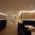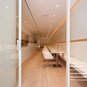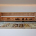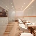 新空间被分为两个主要的功能空间:一是服务空间,它被长方形的柜台所界定,柜台高1米20,白色的外包装给人一种轻盈的空间感。第二个空间是顾客的空间,它由白色的皮革长椅界定,同时周围的墙面强调了空间的连续性和整体性。