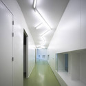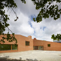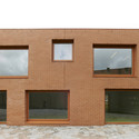 建筑因为朝向,电力设施,还有教室的集中性等原因,整个结构都转向了后侧的花园。为了避免闭塞的感觉,一些巨大的窗户被策略性地放置在了前部的外墙上,它们就像动物的眼睛,这些对应着学校的公共空间,如入口处和游戏区,同时将室内的活动也能展现给外面。外墙的材料是红色的橡胶,它们柔软易辨别,从而突出了建筑的整体愉快的形式。