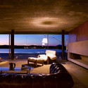 另一个基本概念是设计的安排,简单明了,通过一块平坦的板坯经过合理分布结构的支柱和石墙横向支撑。在板下面,包含卧室(朝向水库),厨房和杂物间(朝向庭院)。在这个区域的两端,两个全玻璃封闭的客厅没有过多繁复的装饰,地面的石材、天花的木材,自然的材质使得室内外融为一体。一张木质长桌贯穿始终,成为客厅的主角。没有刻意的区域划分,大面积的空间留白让人仿若置身户外。