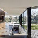 一个七十五英尺场长的水池,其四边中的三边没有明显的边界,水池将住宅一分为二并在基地上的一片大橡树林下流过。住宅的基本结构是混凝土,可以承载大跨度结构。卧室层地板是核桃木地板,而上层地板是石灰石地板。