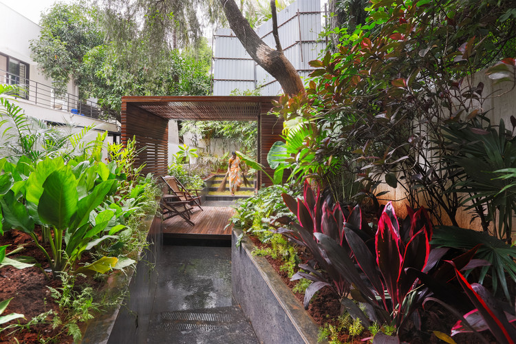 这个项目将一个闲置的 15’x 50’平方英尺的私人住宅地基扩展为一个小型种植园、花园和图书室。这个凉亭被构思成一件可居住的装置,嵌入到葱翠的景色里。建筑结构采用本地回收木材制成的薄木条包盖,作为两个对比强烈的场景之间的一个桥门架,一边是茂密的“野生”花园,另一边是草坪竞技场/席坐区。