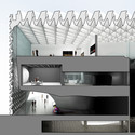 利用“面纱和拱券”这一概念,美术馆融合了两种功能:公共展陈空间和基金会的收藏空间。建筑没有将收藏空间置于低层的地位,而是利用拱券将其作为了美术馆入口和出口的体验之一。在其中总是能看见这种沉重的元素,位于建筑通道的中央。它形成了下方大堂的形式以及公共的交通流线,其顶面是三层的美术馆。