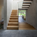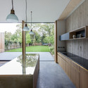 地面层上生活空间的序列缓步进入一个花园,平面上的布局成为了一系列有趣的空间叠层,一层屋顶的灯光创造了一种独特的空间感。似乎室内空间是从混凝土的地面建构上挖掘出来的。一层天光照明的木头盒子控制了向外的景观,外层简洁的黑色砖砌面板以及铝制的立面打破了上层的外立面并且激活了窗户。