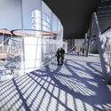 建筑空间通过三层“立体交叉”的布局实现更好的建筑使用体验。展示中心的入口设置在人造“山丘”之上,辅助空间与过境通道“埋”在“山丘”之下。加强了船台与下部商业空间的联系。(图08_View Analysis)建筑主体的方形玻璃盒子下面由三个包裹着展厅,大堂和垂直交通核的通透的玻璃柱体作为支撑。使得来自南侧广场的视线穿过“通透而悬浮”的建筑几乎毫无阻挡的欣赏到江面景色。(图06_Perspective from South Square;图05_Block analysis)主入口大厅可作为展示空间,多媒体演示互动,商业时装发布,商业聚会等功能开放向公众使用。