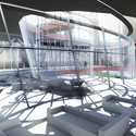 沿船台下行至坡道尽头,可见在主体建筑下的大舞台,同时一路延伸至顶棚的建筑外立面幻化成立体巨型X-GLASS透明LED屏幕,成为戏剧化的户外背景,为公众举办演唱会,时尚发布,狂欢节提供了出色的活动场地。另外,访客可通过玻璃支撑体选择观光电梯或旋转楼梯进入空中的“悬浮”玻璃盒中。玻璃盒顶层为绿化屋面,参观者可至屋顶参观,从而享受“云中360°无死角”的展览,餐饮和艺术空间的体验。