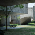 码头的规模很小,只有430平米,功能也很朴素,主要为水路往返的旅行者提供基本的休息、候船、卫生间、和恶劣天气情况下临时过夜等功能。建筑是江边复杂地形的一部分,一条连续曲折的坡道,从江面开始沿岸向上,在几棵树之间曲折缠绕,坡道与两棵大树一起,围合成面向江面的小庭院,庭院由碎石铺成,可以供乘客休息观景。由庭院再向上,坡道先穿过上层坡道形成的一个挑空过道,经两次左转悬空越过自己,然后再次右转,并在高处从两棵大树之间穿出悬挑到江面上,成为一个飘在江面上的观景台。