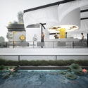 古树、水和光线给了建筑师充分的灵感。建筑师使用协调而有具有张力的现代建筑语言整合场地内的植物、水景和仿古建筑。基于原有的空间环境,建筑师以灌木绿植围合内部空间,将新建筑与古树、老构筑物融合生长,用水景分离新老建筑,将休闲卡座灵活穿插在庭院之间。