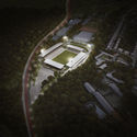 改建方案不仅充分考虑了生态因素,同时致力于强调体育馆的形象,令其成为地区的地标建筑,保留了屋面的北侧的“胜利看台”晚间在强光灯柱的照射下从树木葱郁的树林中凸显出来,令人们从远处便可以一领体育场的风姿。引人瞩目的白色膜结构加建屋面,与体育场看台融为一体。看台的转角处保持开放,人们在体育场内仍可以感受到来自周围树林的自然气息,织物材料的运用塑造了独立的建筑组成部分之间视觉上的整体感。改建后的体育场综合体将为人们留下轻盈、精致而细腻的深刻印象。