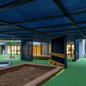 从整理室内外空间水平及垂直联系入手,对原有公共空间的脉络通过打通、连接、附加等手段使其更加联通、完整,赋予流线更多的选择和冗余度。公共空间在基本的交通功能之外,转变为儿童的游戏场所。激活外围的通道,把零散的户外空间串联在一起,室内外空间相互嵌套缠绕起来,原本孤立的中心庭院变得四通八达。地面层全部用于公共活动,除结构和必要的墙体外尽量打开室内外空间的边界。玻璃钢隔栅呵护下的户外空间构成了建筑最外圈层的景观环境,把原建筑的半围合形平面补全为完整的环形,嵌入游戏、教学和景观设施。建筑西侧的户外楼梯和栈桥从地面连接到二、三层室内走廊并延伸到屋顶运动场,帮助室内外形成更多的路径回路。