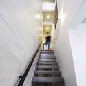 从小屋一层开始,该楼梯改变了朝向,使整个三层高的开口处于宽阔的明亮而又通风的空间之上。在有限的预算条件下,整个小屋的室内设计实现了简约设计,并尽可能采用当地建材。整个小屋室内主要为涂刷为灰色的水泥墙,白色粉刷的砖墙,并点缀以少量黑色涂漆的钢制建筑细部和深棕色红色相间多层胶合木家具。