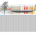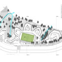 建筑是非常规整的健身设施,整体被分成四个体量,现有的足球场进行了一定的改造,成为中央核心连接了不同的部分,体量因为树木的存在形成了精准的分布,两条小溪越过场地。现有的城市平台被扩展成了大型的公共露台,像看台般环绕着足球场。