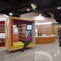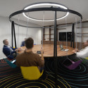 几个“智库”也散布在这个开放办公空间里;这些可移动的箱子用彩色织物进行软装,安装有屏幕、灯光和HDMI-USB连接线,能够连到任意楼层的箱子来听即兴非正式的演讲、参加快速头脑风暴会议或者只是来点放松。