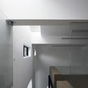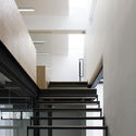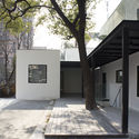 由于身处居民区内,办公室的私密性也是要解决的问题,我们将室外平台设置在背对居民区的南侧。北侧通过加建的实墙,与居民的视线隔绝。而顶部的天窗和底部的条窗则与户外空间产生联系,使空间神秘而不压抑。泵房有六米的层高,开了很多高侧窗。加建的夹层空间正好可以利用这些窗,只是对其比例尺寸稍有调整。原有的地下储水空间被我们改造为地下室。为避免沼气的隐患,我们将地下室的入口设于室外,利用原来的弧面挡土墙和主体建筑的空隙,布置了悬挑楼梯。紧贴着建筑生长的两颗老树,在纯净的白色墙面的映衬下,更显得生机盎然。