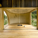大阳台是用落叶松木板建造的。阳台是一个独特的空间,能够观察水位和水下的动态。旁边靠近装饰品的地方有另一个重要的主题,它是一个圆形的石膏墙壁,集成了三个著名的日本竹花瓶,用作祭奠,上面有鲜花和书法。