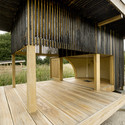 这座黑色的茶馆位于花园的南部边缘,花园里的小湖里能够映射出它的倒影。这座植物园已经成为了附近松林的一部分,其南部边缘是个s型的小湖,湖边有着绿色的草坪,让这里的住户有着一个优美的环境。这个茶馆就是精心设计的风景的一部分。主人和客人可以在这里边喝茶边欣赏风景。这里还可举办小型聚会,是一个小地方聚集,是一个喝茶的好地方。