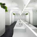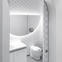 洗手间的白色墙身及天花以拱形接合成一整体 。拱形采用GRG玻璃纤维强化石膏板,是耐用的环保物料。拱形减少积聚尘垢的边缘,亦能散射LED灯光予植物及洗手间整体照明。