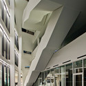 一个令人亲近的圆形广场像是在欢迎参观者。玻璃的门厅是广场空间的延续。同室外一样,也具有混凝土地板和陶土外墙。底层为中央循环空间,包括会议厅、食堂、期刊阅览室和一个露天阳台。继续向里走,是位于不同楼层的阅读室,与主建筑体相连接,可以看到室外的森林景观。两面玻璃外墙对着木材,并在夜间将其照亮。白天,树木被日观照的熠熠生辉,成为室内景观的一部分。该建筑空间多种多样,很容易转化。室内,白色为主导色,使得书籍和人们在建筑内十分明显。