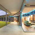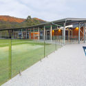 形如飞去来器(boomerang)一般的屋顶悬架在钢结构框架之上,在人眼高度几乎不可见,它又能收集雨水、继而导流向地下水箱之中。